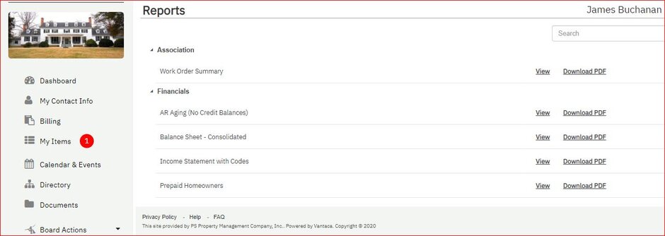 The area allows your HOA board members to run certain financial reports at any time. Being able to see all financial information even between monthly reporting periods is important to have when tracking expenses related to an ongoing project or reviewing payment plan statuses.